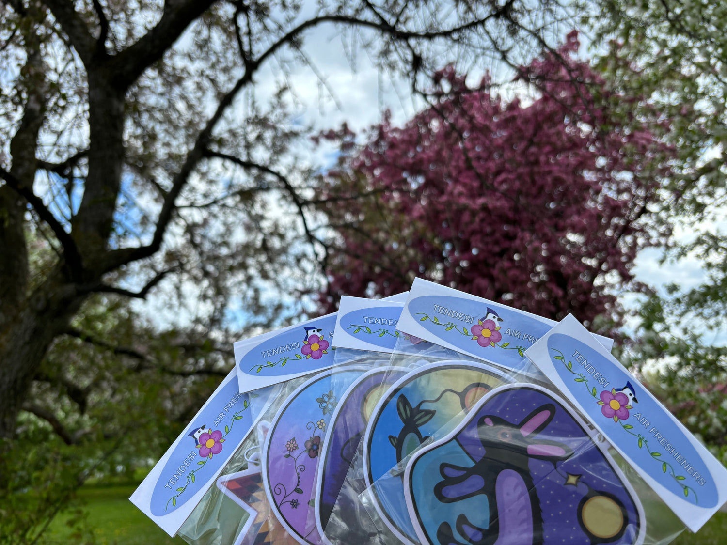 Tendesi Air Fresheners is an owned and operated Indigenous business created by 3 Anishinabe sisters from Kitigan Zibi, Quebec. Tendesi Air Fresheners offers unique Indigenous artwork that improves overall odor and quality of air. We are proud to introduce Tendesi Air Fresheners